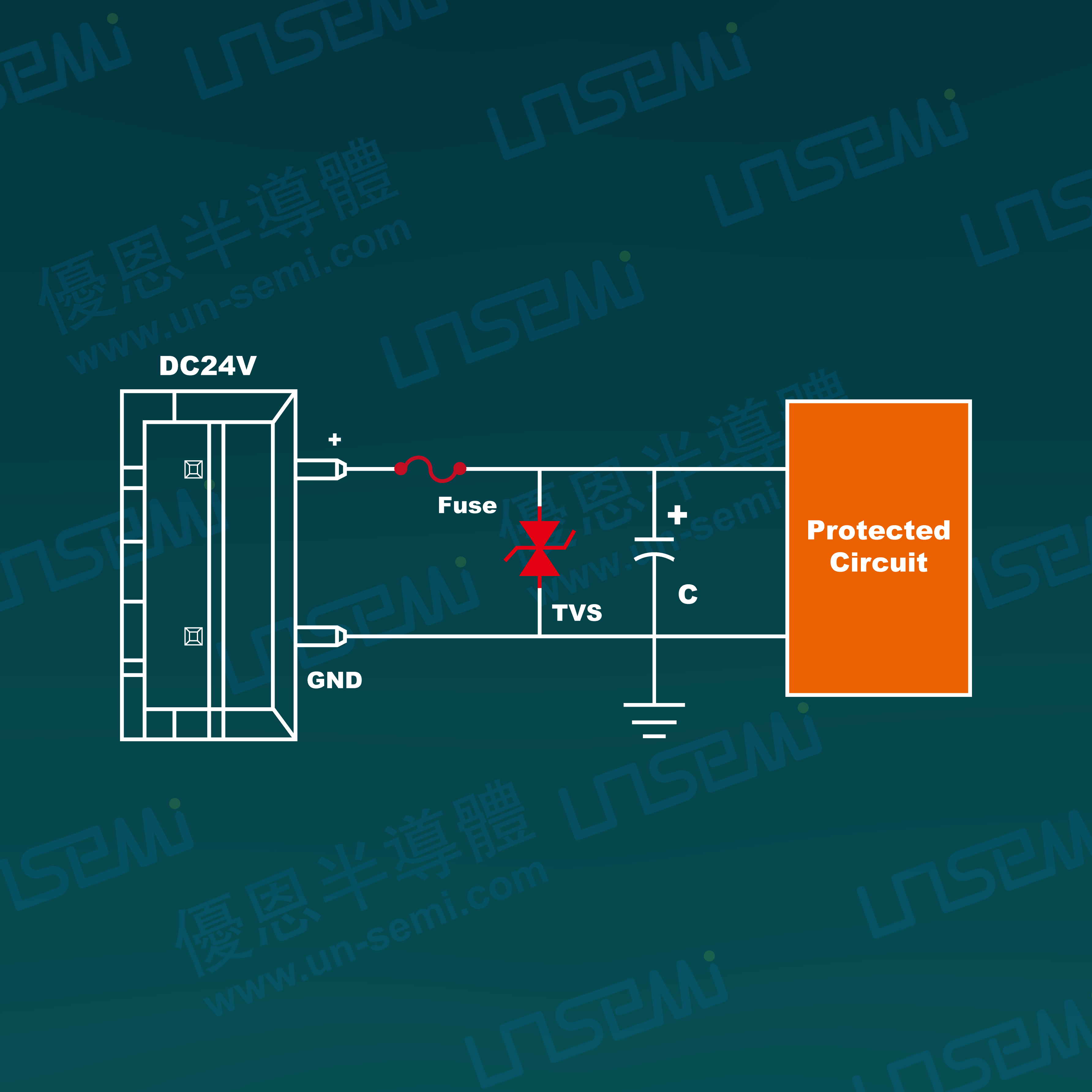 1、根据电路的最大工作电流及浪涌电流的大小选择合适的熔断保险做后端负载过载、短路及TVS管失效时的保护;