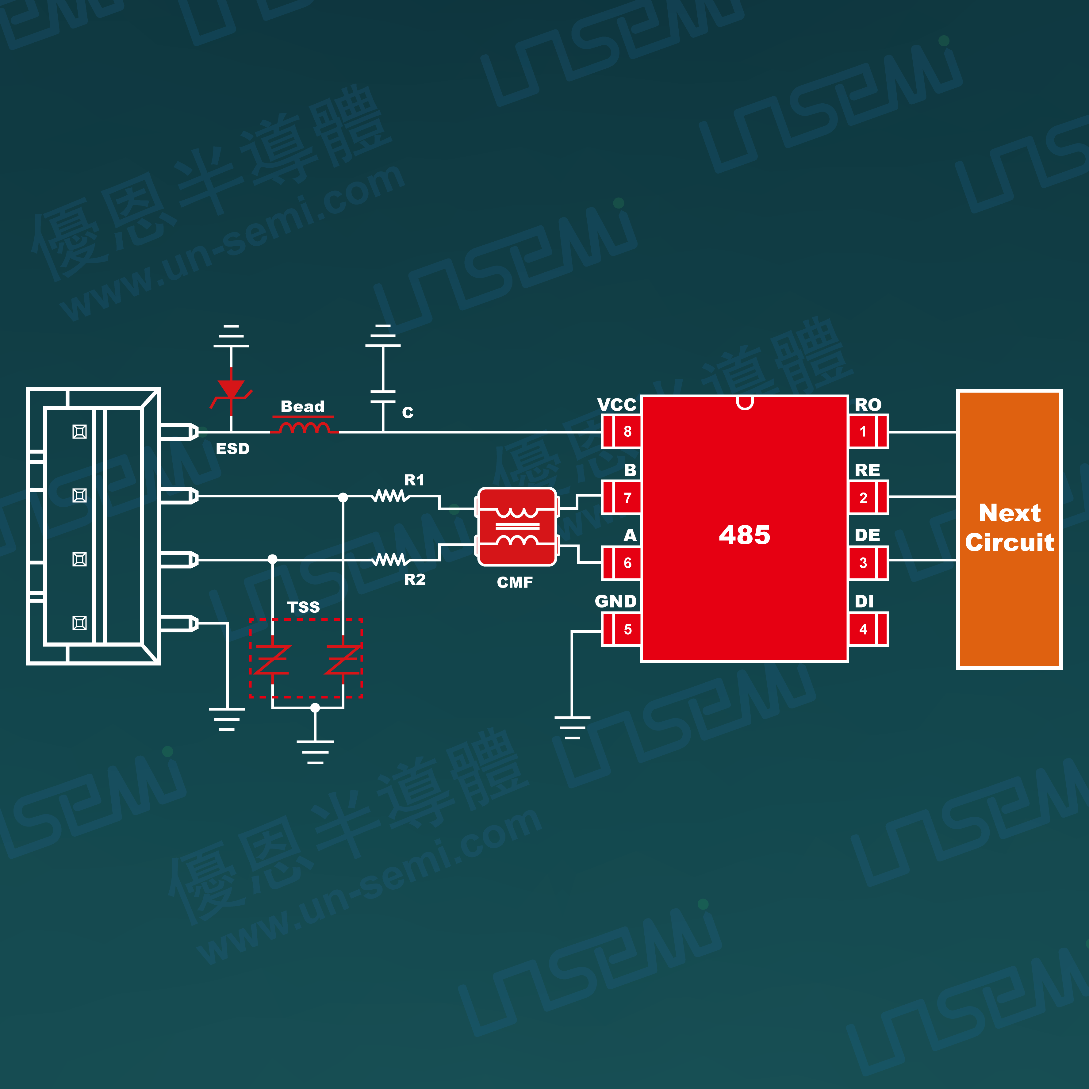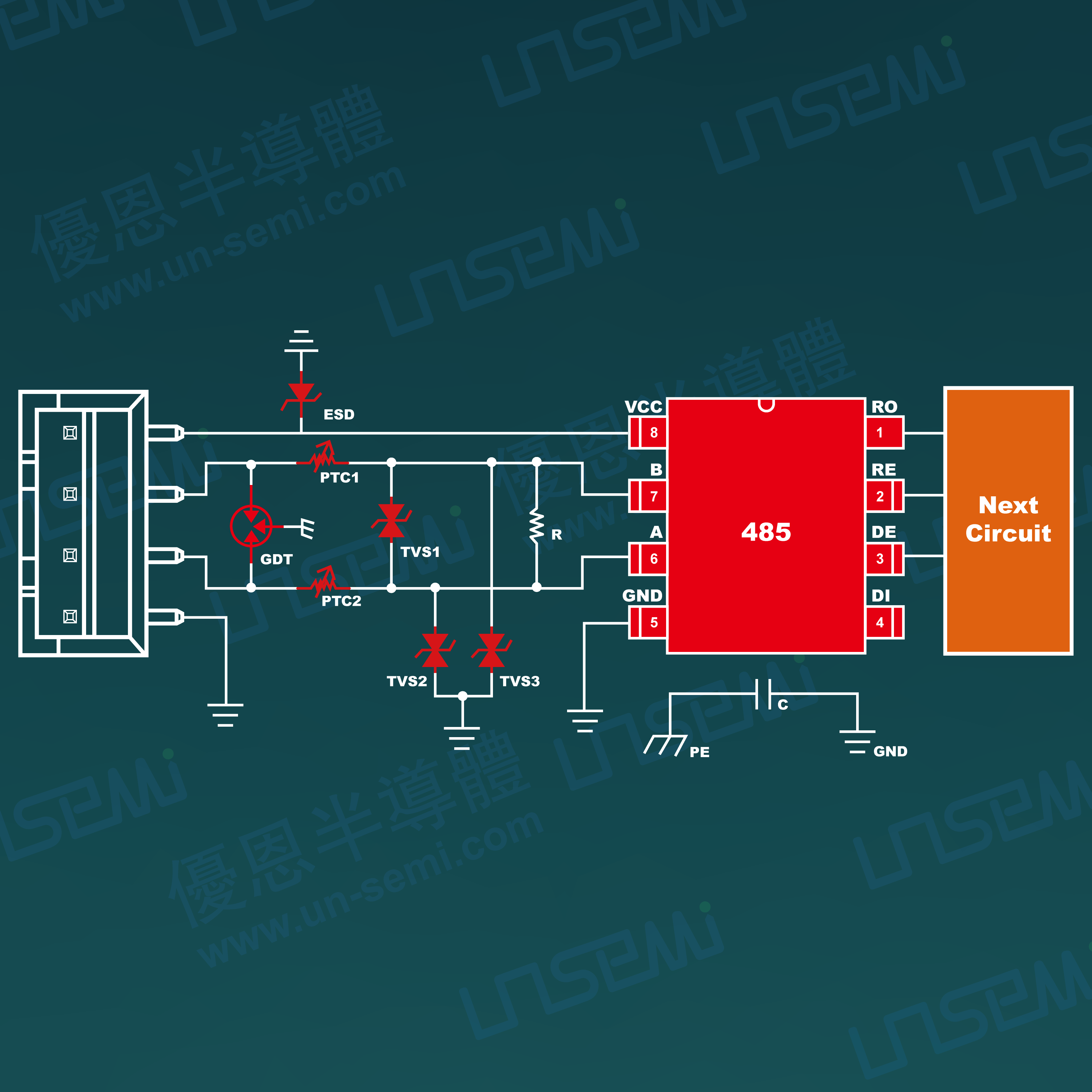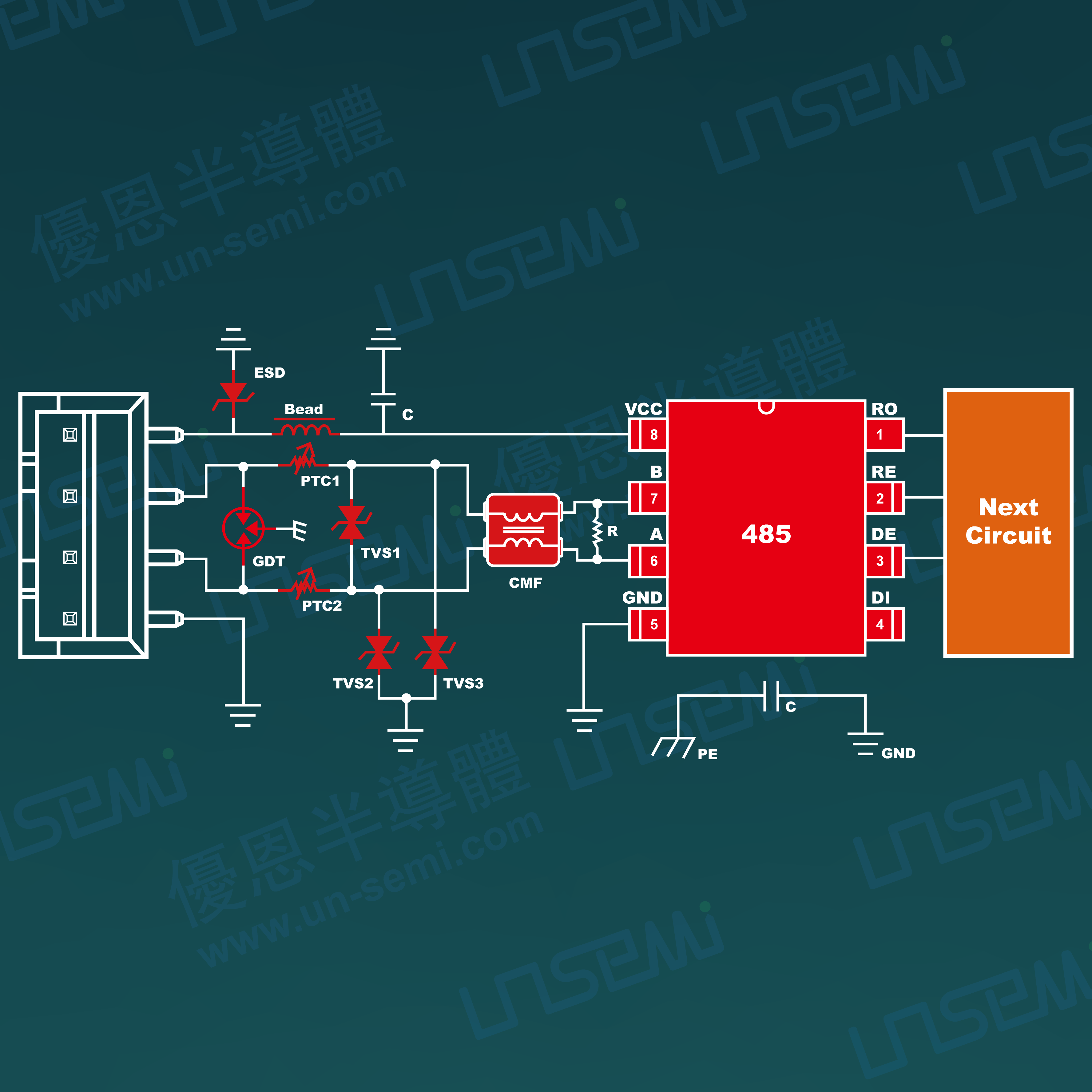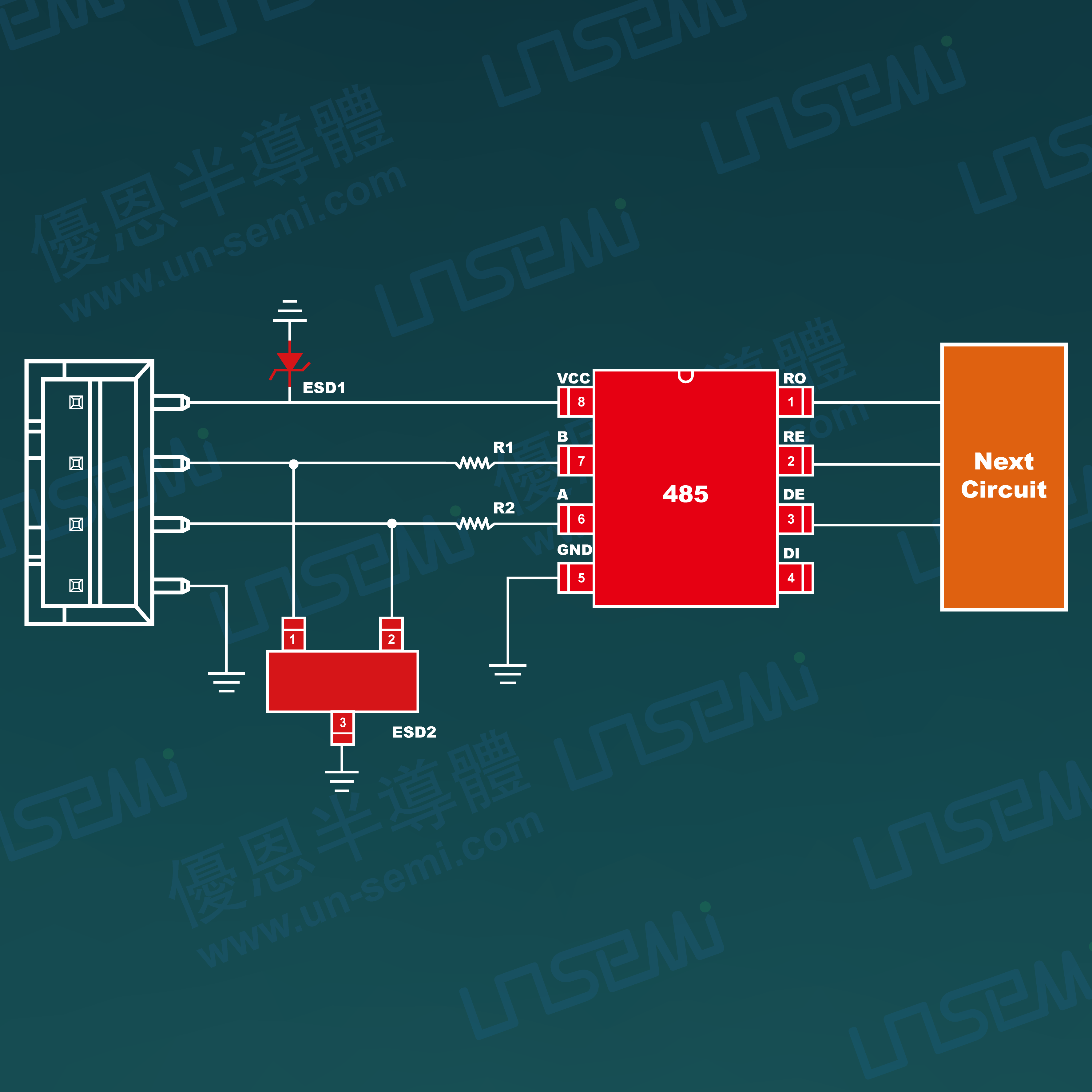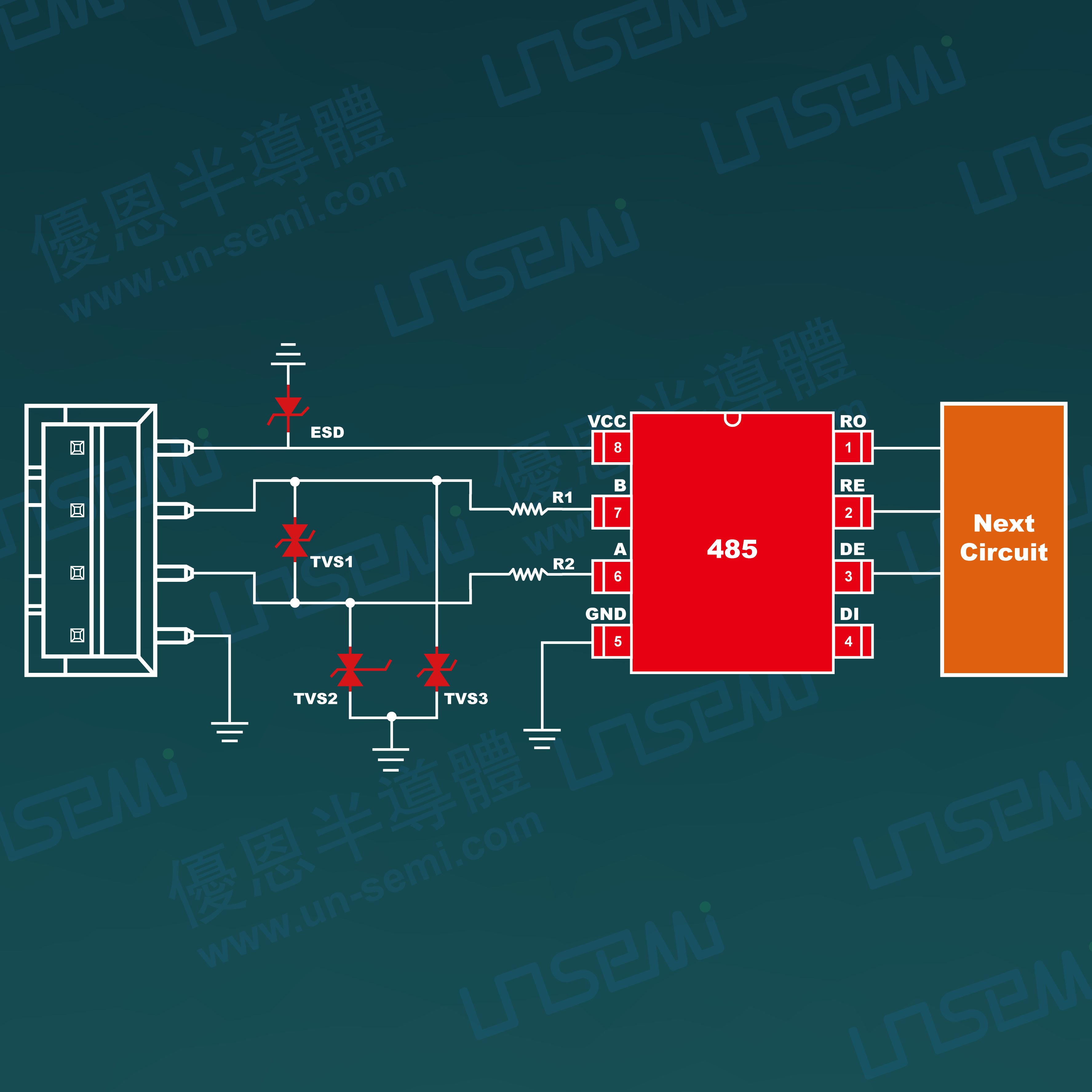 4、配合公司性能稳定、可靠的RS485芯片,在不影响数据传输的前提下满足IEC61000-4-2静电放电及IEC61000-4-5雷击浪涌防护需求,让后端的电路得到有效全面的防护。