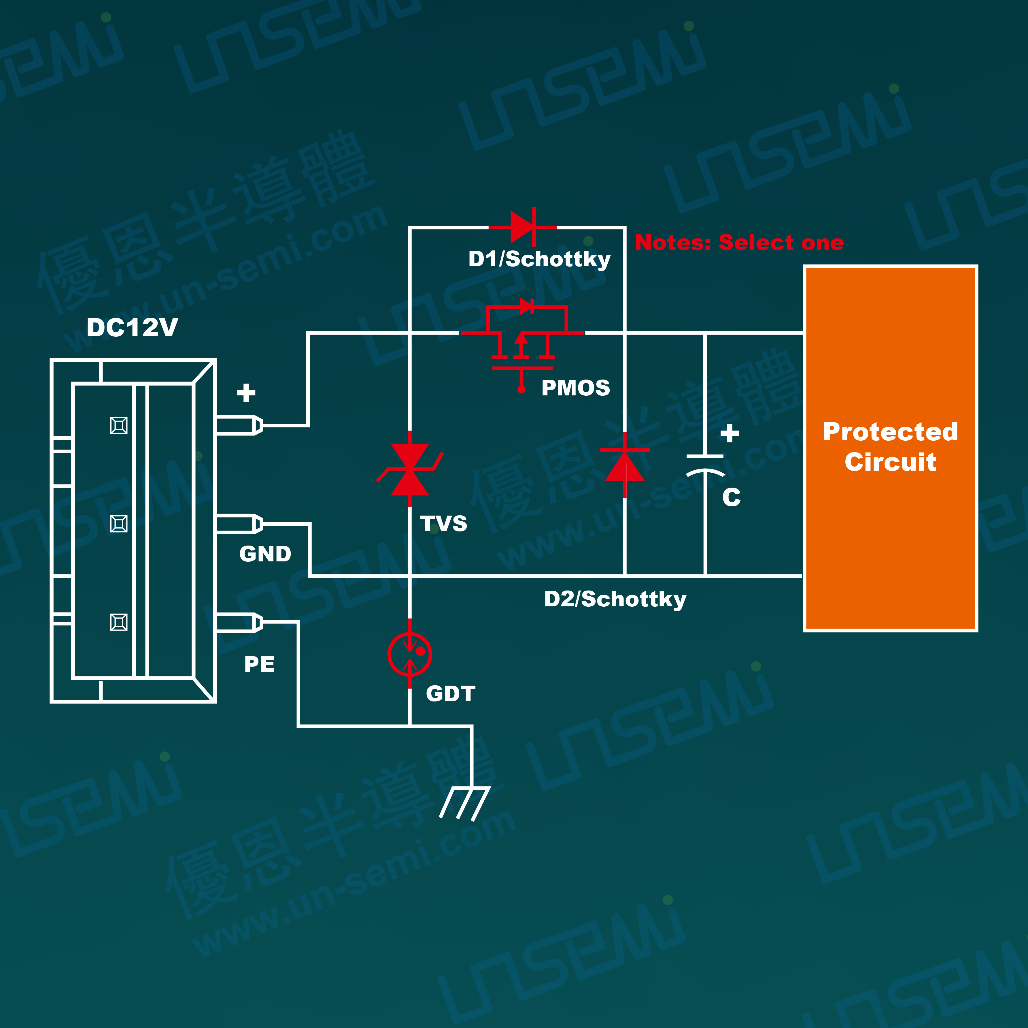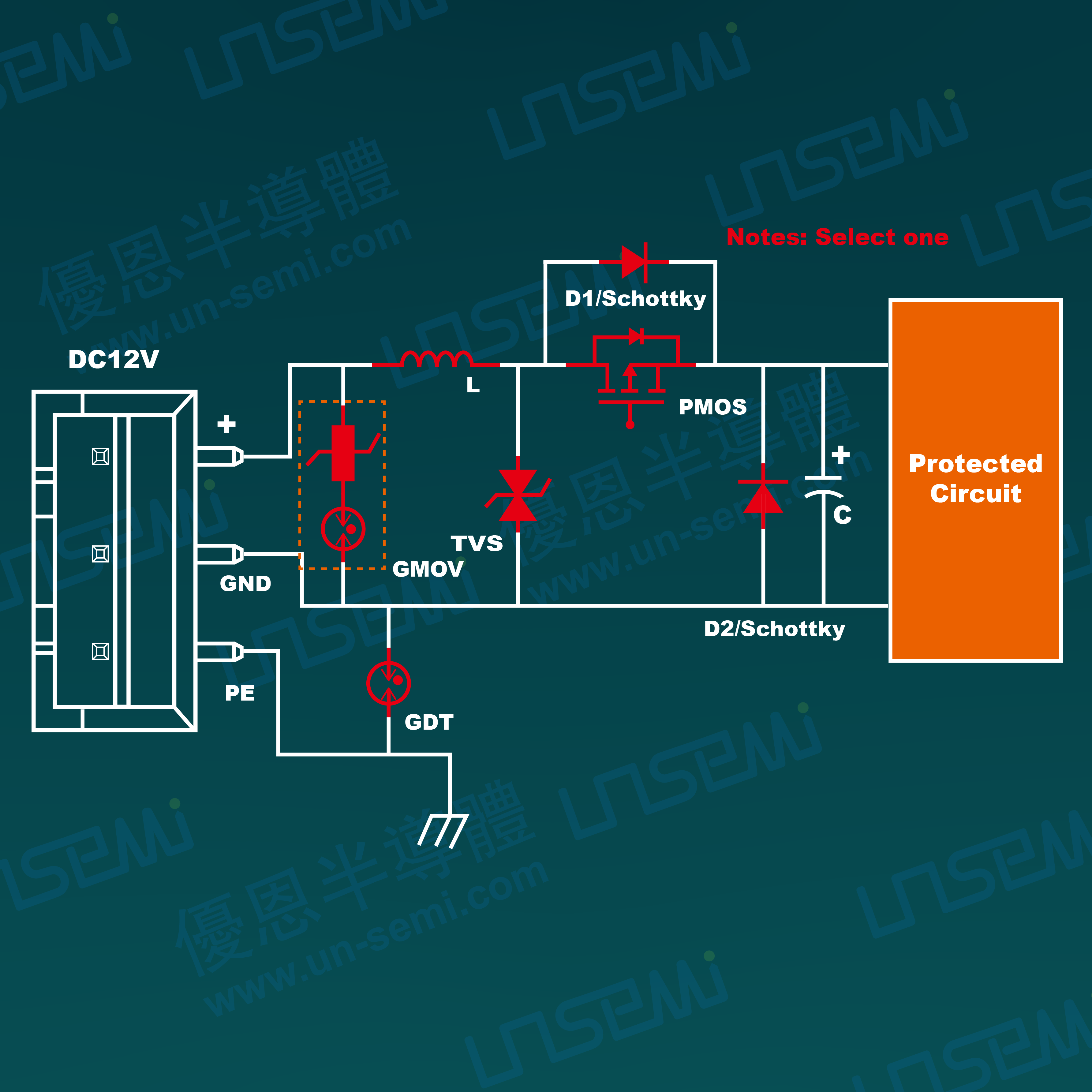 5、在TVS管保护后级串接PMOS管或者低压降的肖特基二极管做极性反接保护,低内阻的MOS管可以有效降低功率损耗,减少发热量;
